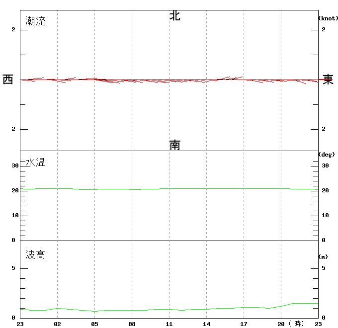 上層(6m)の潮流、上層(1m)の水温、波高