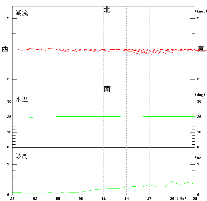上層(6m)の潮流、上層(1m)の水温、波高