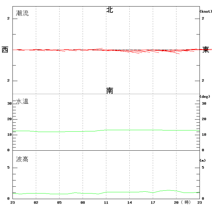 上層(6m)の潮流、上層(1m)の水温、波高
