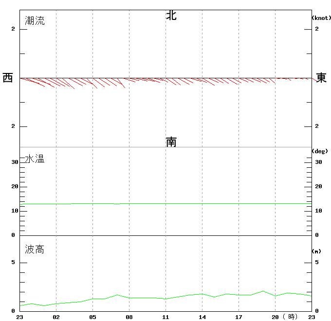 上層(6m)の潮流、上層(1m)の水温、波高