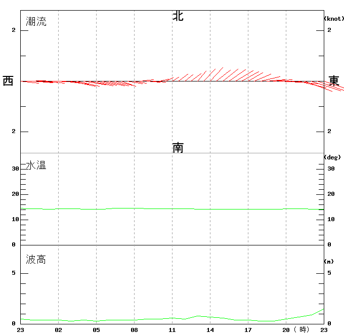 上層(6m)の潮流、上層(1m)の水温、波高