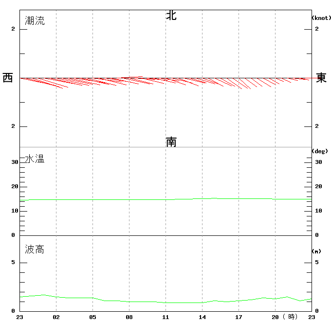上層(6m)の潮流、上層(1m)の水温、波高